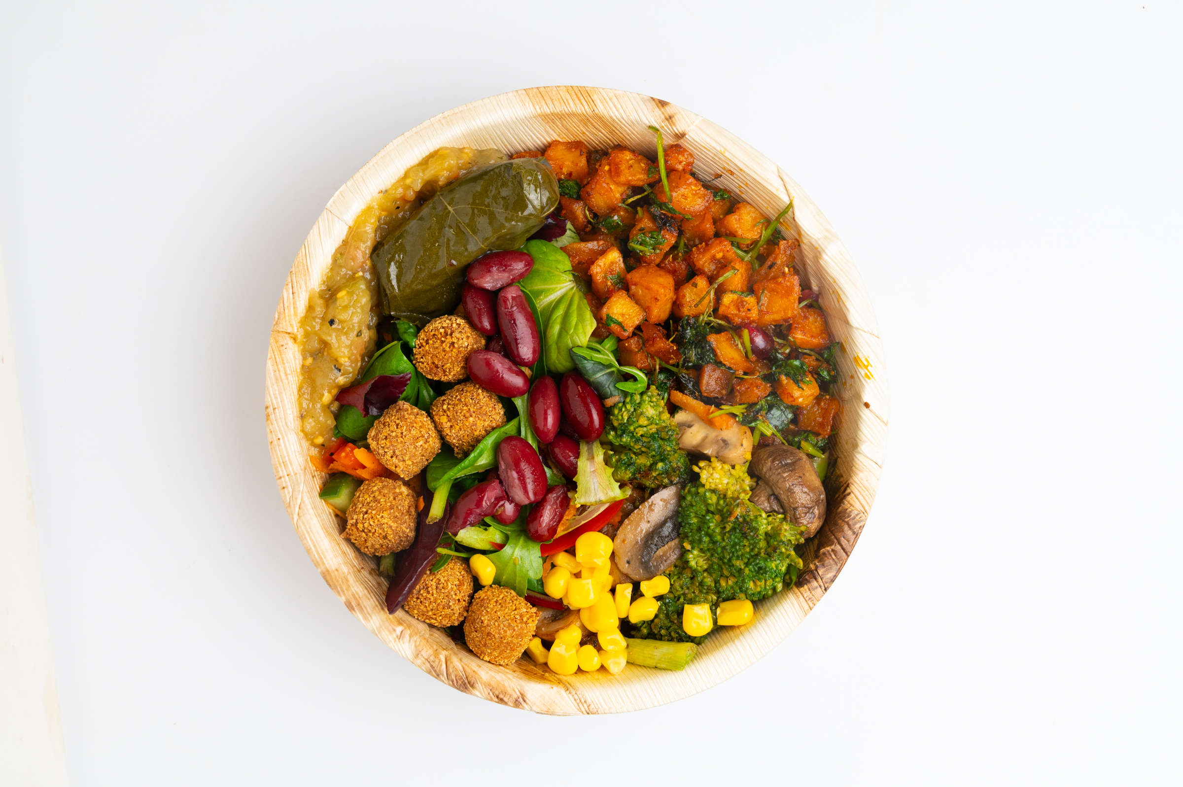 Zutaten: Brokkoli, Ofenkartoffeln, Falafel, Weinblatt, Baba Ghanoush, Mais, Bohnen, Gemüse, Gewürze