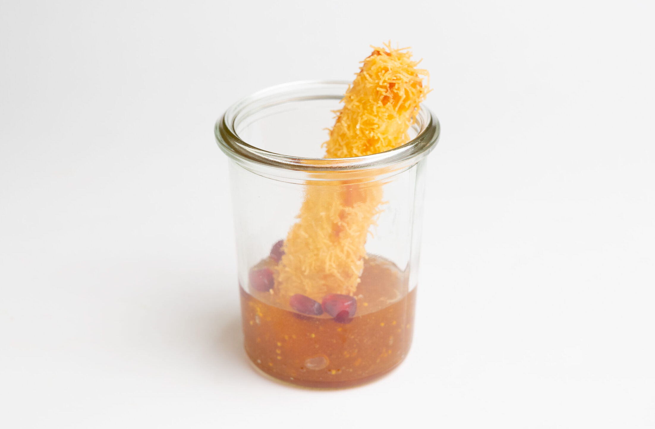Handwerk: Cremiger Halloumi wird sorgfältig portioniert, in feinen Fadenteig eingeschlagen und goldbraun ausgebacken. Durch das schonende Frittieren entsteht eine gleichmäßig knusprige Hülle, während der Käse im Inneren seine zarte, schmelzende Textur behält. Anschließend wird er frisch angerichtet und mit einem hausgemachten Süß Sauer Dip serviert.